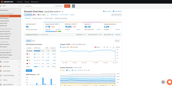 SEMrush est une boîte à outils SEO tout-en-un qui permet aux utilisateurs d’accéder à une large gamme d’outils et de ressources pour améliorer le classement de leur site dans les moteurs de recherche. Ces outils comprennent un outil de recherche de mots clés, un outil d’optimisation sur page, un outil d’analyse des liens retour et un outil d’analyse de la concurrence.