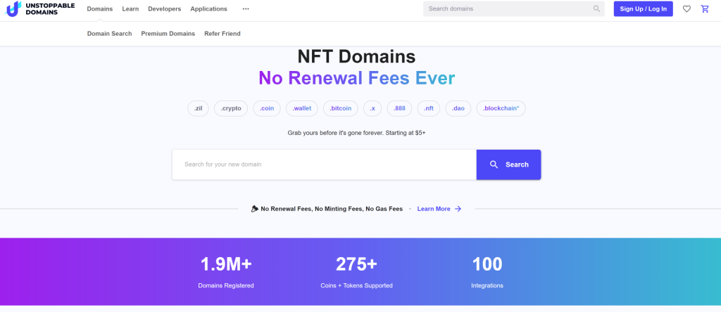 Ces derniers temps, le nom de domaine basé sur la blockchain a le vent en poupe. Par définition, Unstoppable Domains est un projet proposant un service d’enregistrement de nom de domaine sur la blockchain. Il permet à l’utilisateur d’acheter son propre domaine blockchain en .zil , .crypto ou bien d’autre et le garder à vie. Une fois que vous avez un nom de domaine, vous n’aurez plus besoin de faire des copier-coller d’adresse à rallonge quand vous envoyez vos cryptos à quelqu’un.